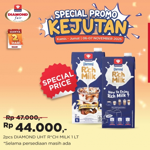 DIAMONDfair menghadirkan produk-produk terbaik seperti susu UHT, susu fresh milk, ice cream, yogurt, keju, pasta, puding hingga frozen food. Nikmati promo rutin bulanan yang selalu DIAMONDfair hadirkan khusus untukmu.